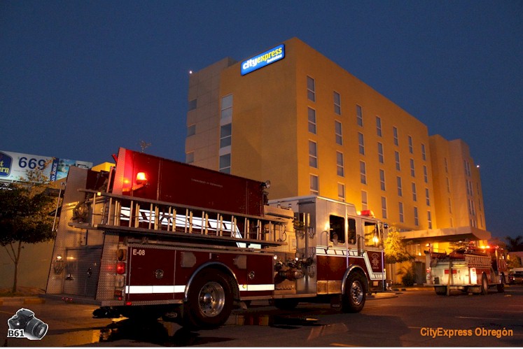 Jun 09,2014 - Bomberos trabajando en el Hotel City Express #Obregón calle Miguel Alemán norte por emanación de humo proveniente de la sala de máquinas. El incidente fue controlado a tiempo y afortunadamente no se registraron daños mayores, solamente un susto para los huéspedes del hotel.